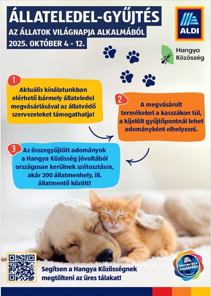 Arra kérünk mindenkit, hogy idén is gondoljon a nehéz sorsú állatokra, és a hétvégi vásárlásakor tegyen egy tetszőleges állateledelt a kosarába, amit a fizetés után a kasszák melletti gyűjtőpontokon adhat le. A több mint 180 Aldi üzletben bárhol le lehet adni 2025. október 4-e és október 12-e között.